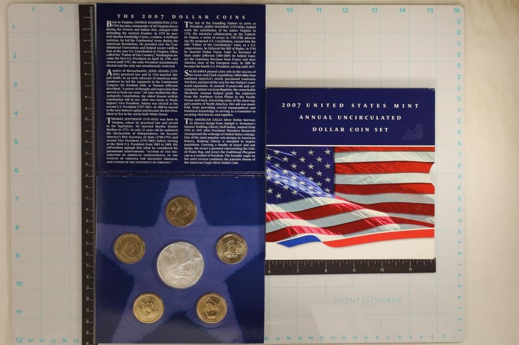 Sold2007 U.S. Mint Annual Uncirc. Dollar Coin Set2007 U.S. Mint Annual Uncirc. Dollar Coin Set Condition YES WE SHIP ALL COINS. Pricing depends on destination, we will take the most cost effective option any where in the USA Plus insurance! We wilSee Sold Price