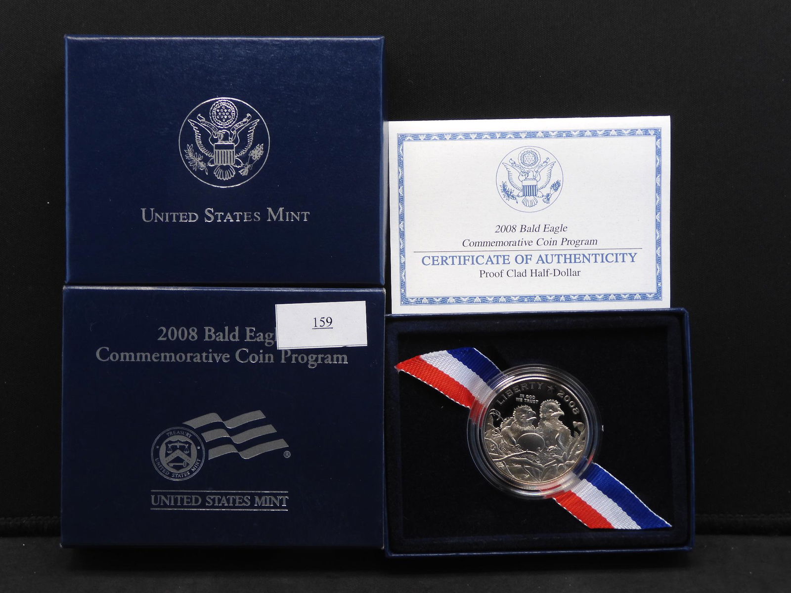 Sold4 U.S. Items Incl $1 2008 Proof Bald Eagle SilverAlso includes 2 2008 proof bald eagle half dollars (one clad), and 1991 Proof mount Rushmore half dollar. Each in original boxes with displays and COAs. IMPORTANT: Before bidding, please read the termSee Sold Price