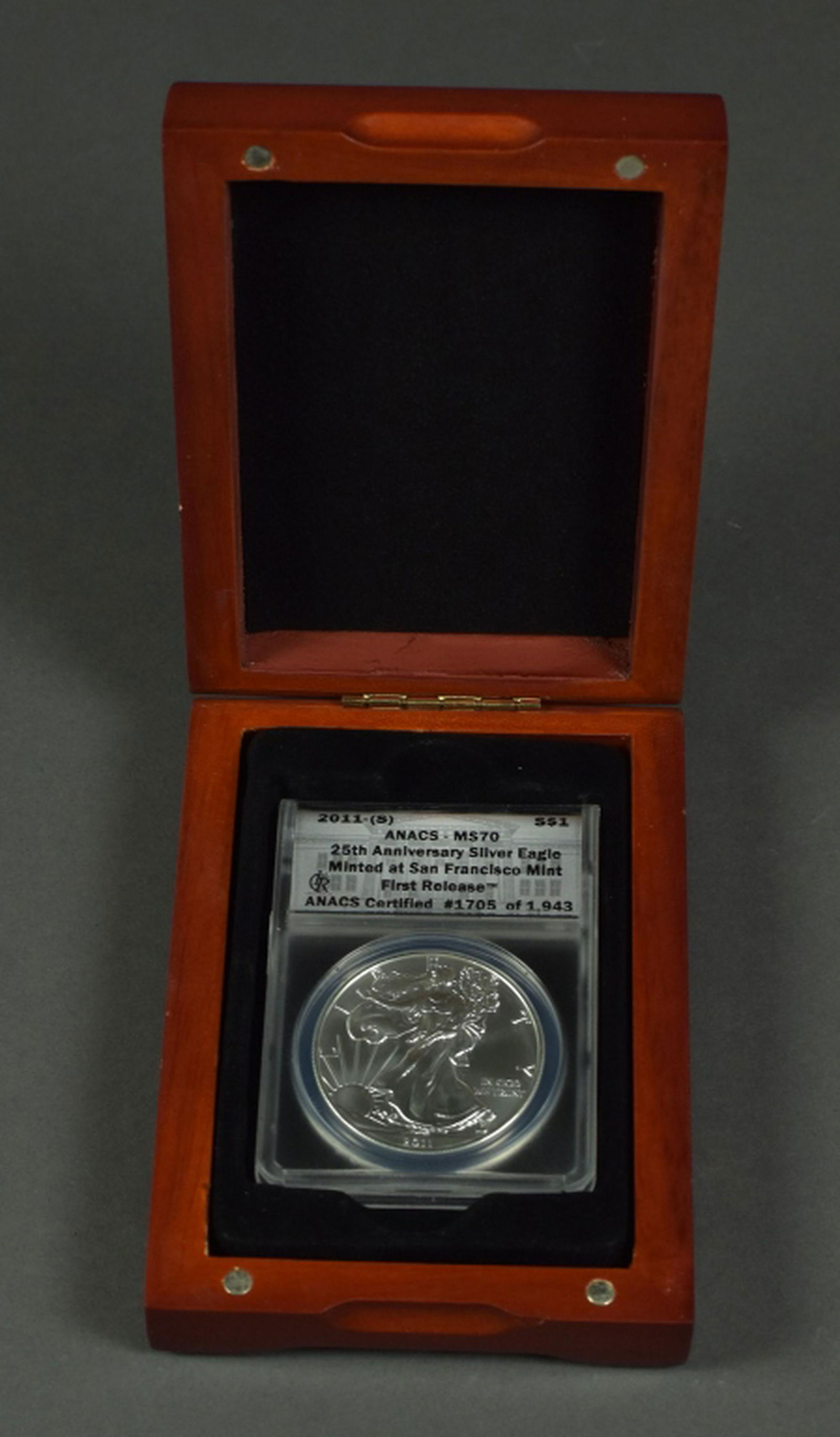 Sold2011 25th Anniversary Silver Eagle ANACS MS70 First Day of Issue*Please read our terms and conditions carefully before bidding.See Sold Price