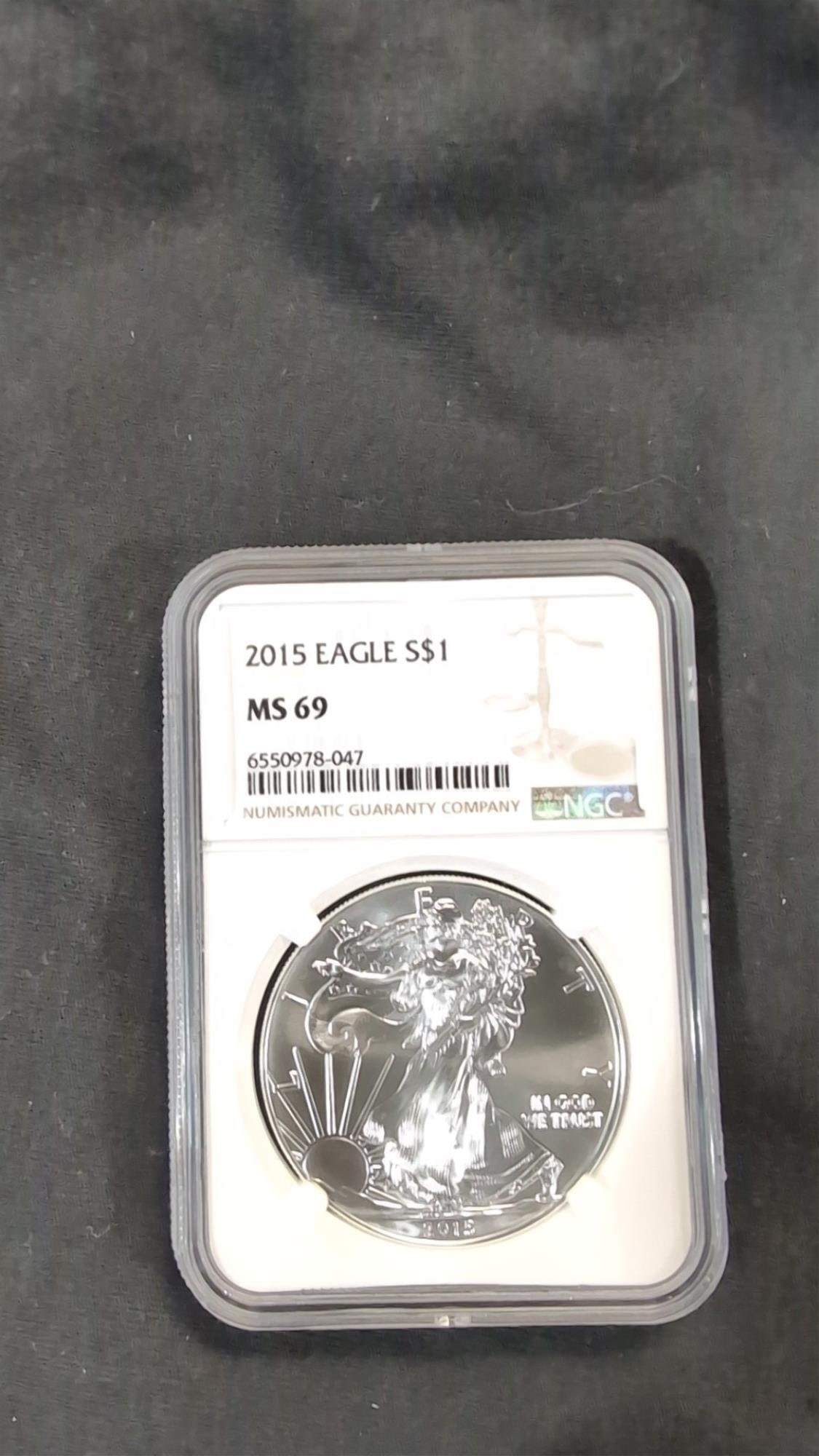 2022 W US American Silver Eagle 1 oz .999 Fine Silver NGC Graded MS70Mar 14, 20262012 W US American Silver Eagle 1 oz .999 Fine Silver PCGS Graded MS69Mar 14, 20262003 American Silver Eagle NGC MS69Mar 15, 20262014 American Silver Eagle NGC MS69Mar 15, 20262014W $1 Proof American Silver Eagle NGC PF69UC6 days Left2014W $1 Proof American Silver Eagle NGC PF69UC2 days Left2010 Silver Eagle NGC MS69780 Lots Away2024 US American Silver Eagle 1 oz .999 Fine Silver NGC Graded MS70Mar 14, 2026Graded 2005 One Ounce .999 Fine Silver Eagle - MS69 by NGCMar 12, 20262010 US American Silver Eagle 1 oz .999 Fine Silver PCGS Graded MS70Mar 14, 2026Graded 2003-W One Ounce .999 Fine Silver Eagle - PF69 Ultra Cameo by NGCMar 12, 20262022 American Silver Eagle NGC MS69Mar 15, 2026Graded 2015 One Ounce .999 Fine Silver Eagle - MS70 by PCGSMar 12, 20262013 American Silver Eagle NGC MS69Mar 15, 20261987 American Silver Eagle NGC MS69Mar 15, 20262021 US American Silver Eagle 1 oz .999 Fine Silver PCGS Graded MS70Mar 14, 2026