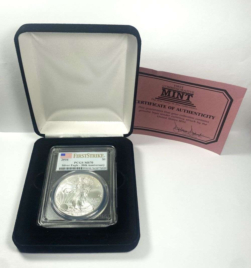 Sold2016 First Strike 30th Anni. Silver Eagle PCGS MS702016 First Strike 30th Anniversary American Silver Eagle PCGS MS70Winner shall receive the exact coin shown here. (EM/PB)See Sold Price