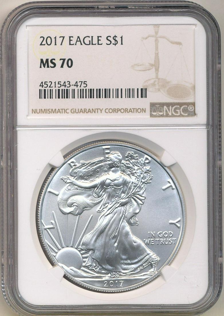 Sold2017 American Silver Eagle MS-70 NGC2017 American Silver Eagle MS-70 NGC SKU: RBJ238230 Year: 2017 Grade: MS-70 Grade Service: NGC Denomination: 1 Dollar Mint Mark: W - West Point (Not Shown) Metal Content: 1 troy oz <bSee Sold Price