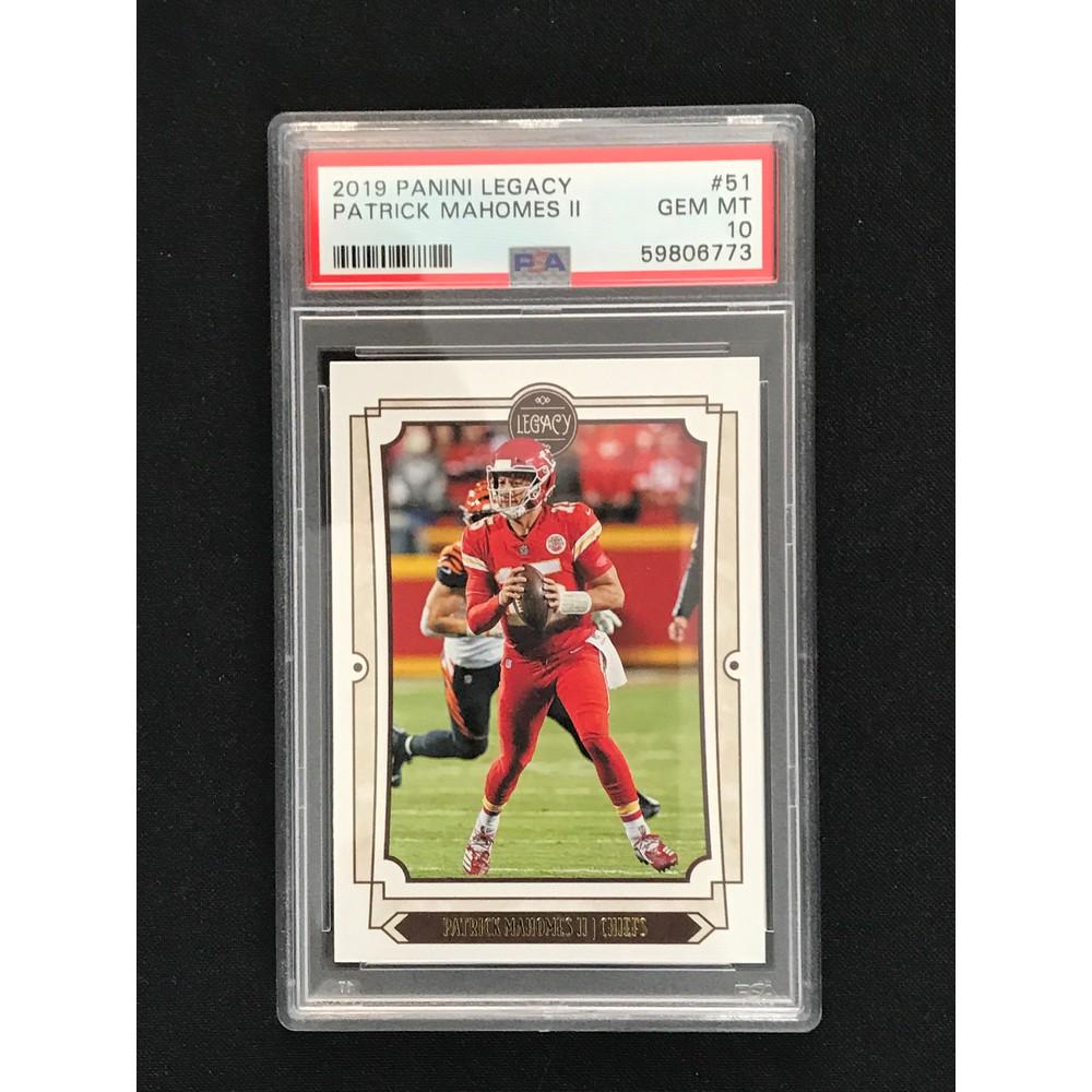 Sold2019 Panini Patrick Mahomes II Football Card PSA102019 Panini Donruss football trading card featuring superstar quarterback Patrick Mahomes II of the Kansas City Chiefs. Graded PSA GEM MT 10, this sharp example showcases Mahomes in action on card #1See Sold Price