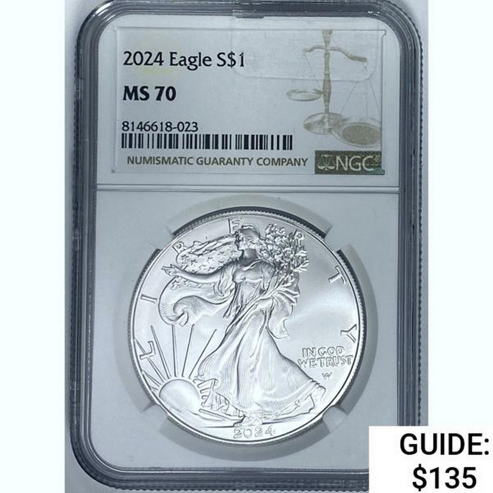 Sold2024 (W) Silver Eagle Dollar MS70 NGC FDOIFirst Day of Issue. Struck at West Point Mint. The obverse side features full length of Liberty in stride. She is shown wrapped in the folds of the flag of the United States, and carrying laurel and oSee Sold Price