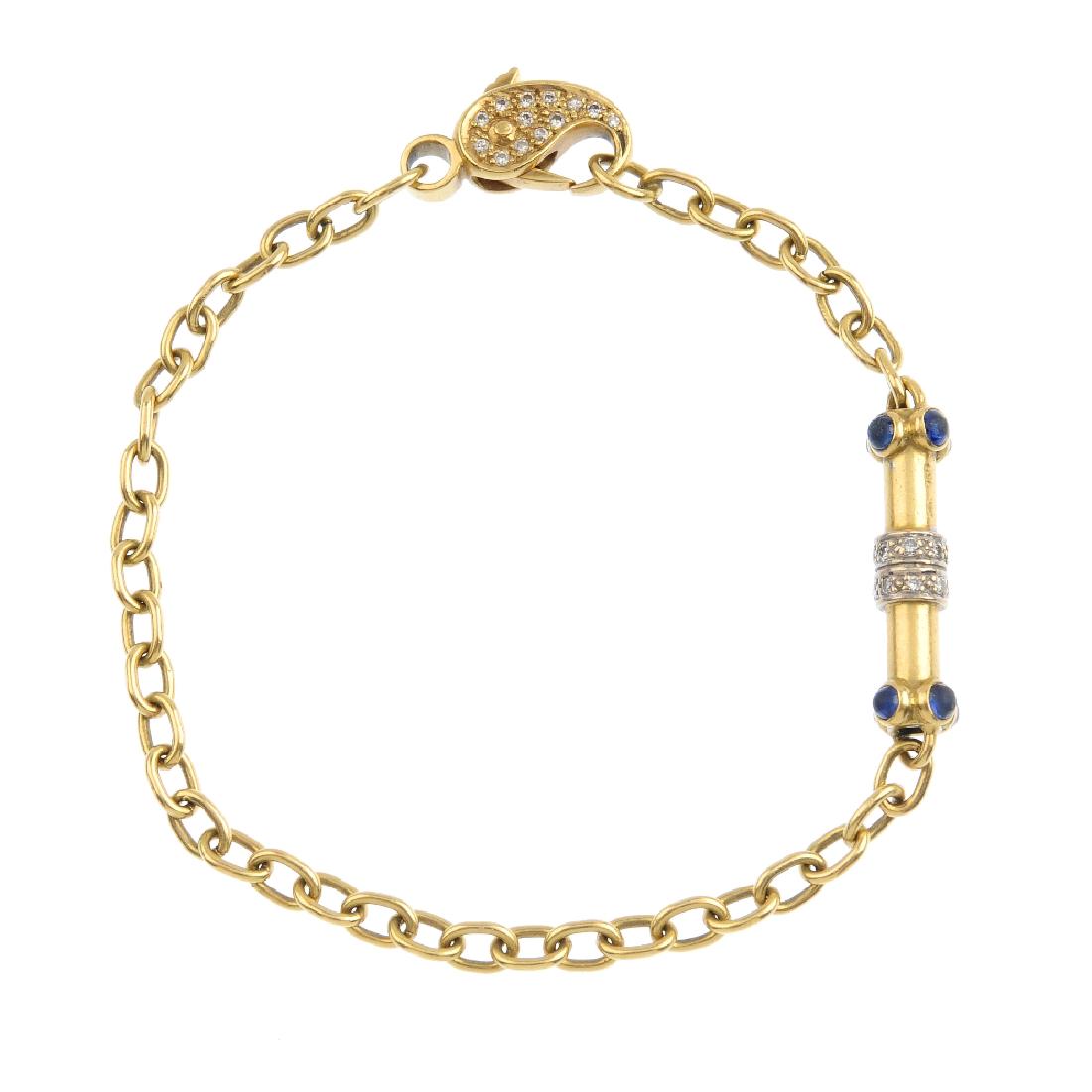SoldTwo 9ct gold diamond and gem-set bracelets. The firstTwo 9ct gold diamond and gem-set bracelets. The first designed as an alternating series of single-cut diamond and polished heart panels with openwork bar spacers, the second designed as a series of ovSee Sold Price