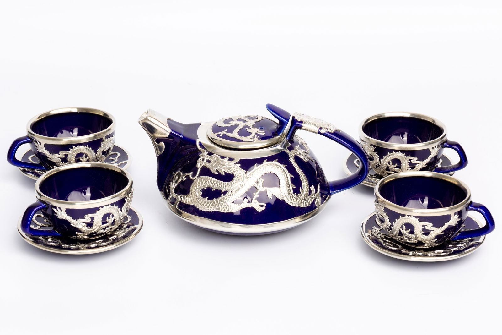 20TH CENTURY SILVER INLAY DRAGON TEA SET