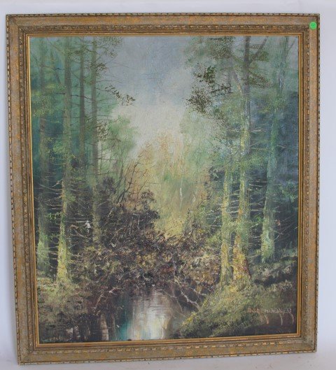 Original James P. Bonelli Lush Green Verdant Rooftops Landscape Oil on Canvas Signed Framed PaintingCa. second to third quarter 20thC. Original oil on canvas painting by American artist James P. Bonelli (1916-2000) Philadelphia, Pennsylvania. Approx. canvas size 21" x 26". Very good as shown with no
