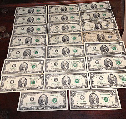 21 $2 Dollar Bills and Two $1 Dollar Silver
