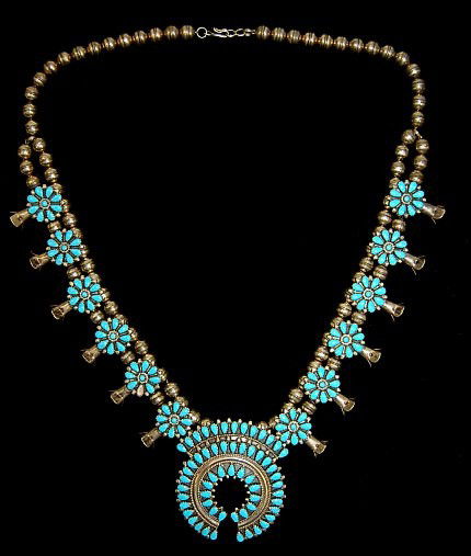 SoldVintage Navajo Sterling Turquoise Squash Blossom Necklace 115.7gVintage Navajo Sterling Turquoise Squash Blossom Necklace 115.7g 25.75See Sold Price