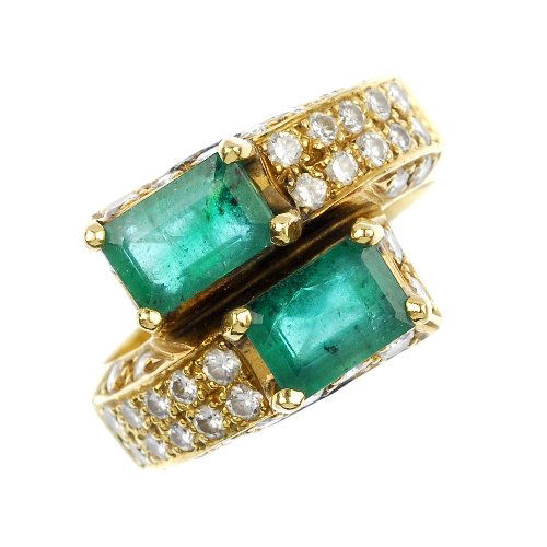 (27783) An emerald and diamond crossover ring.