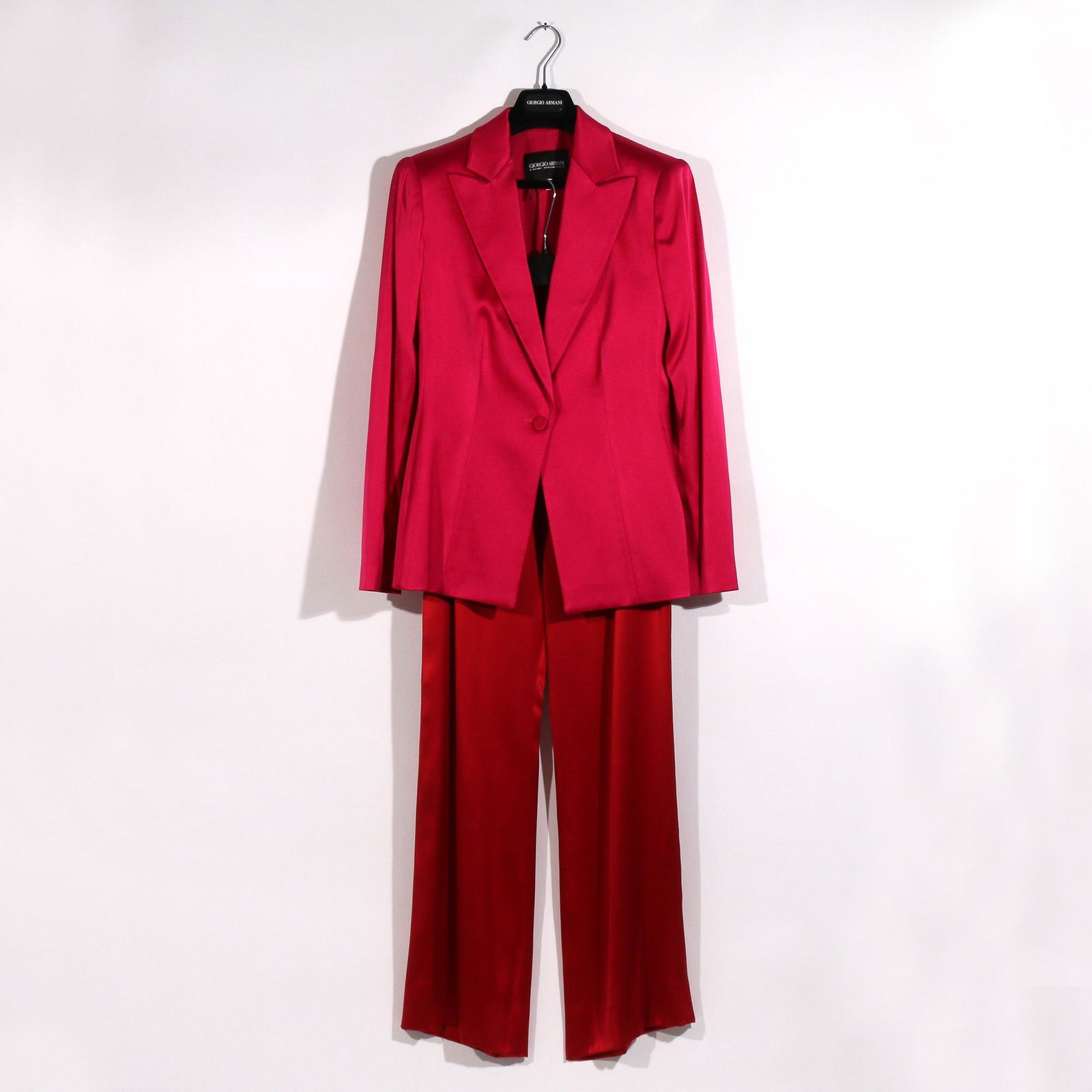 SoldGiorgio Armani SuitA red three-piece silk skirt suit by Giorgio Armani (size 44), and blouse (size 42).See Sold Price