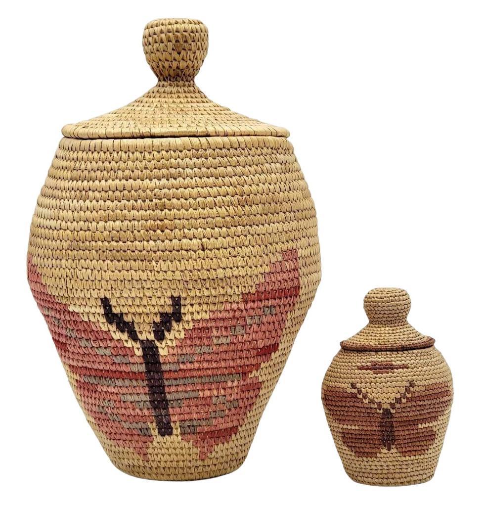 2x Eskimo Lidded Grass Baskets with Butterfly Designs