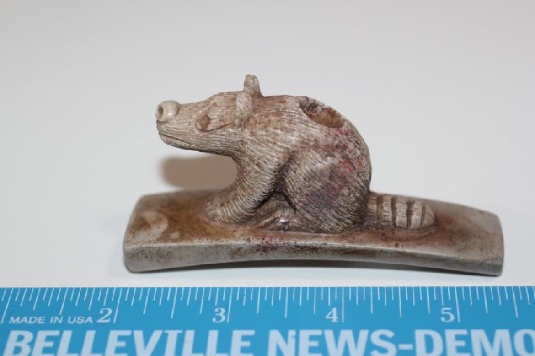 SoldSteatite Bear Effigy Platform Pipe8 ½” x 3 3/8” Steatite Bear Effigy Platform Pipe, Old Tag Reads “Platform Pipe from Harlan Co. Tenn.See Sold Price