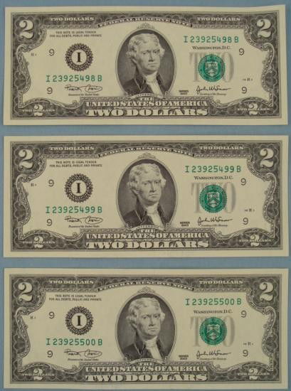 (3) 2003 $2 Bills Consecutive # Minnesota Notes UNC