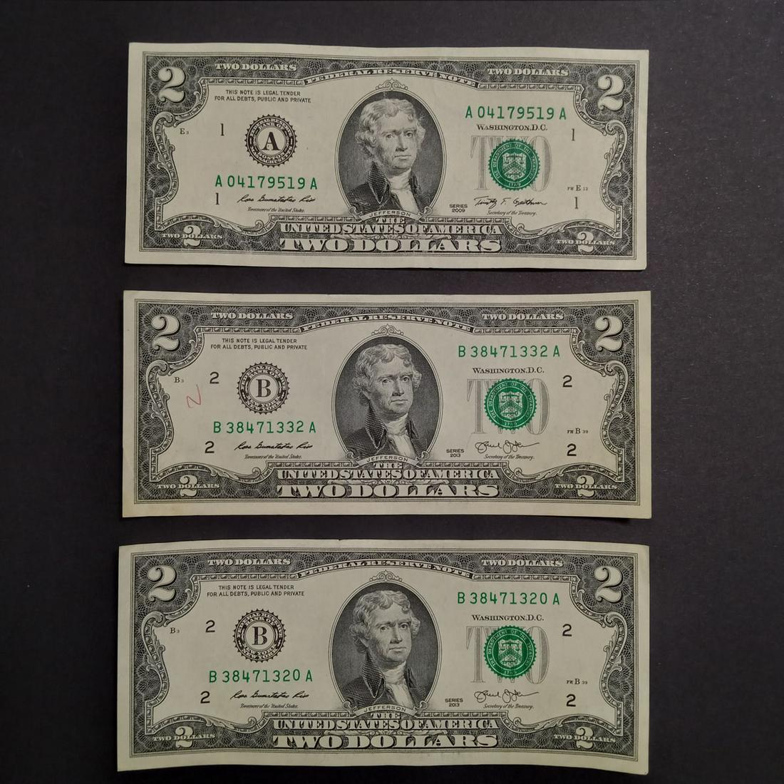 3 2013 US Fed Reserve $2 two dollar bills notes