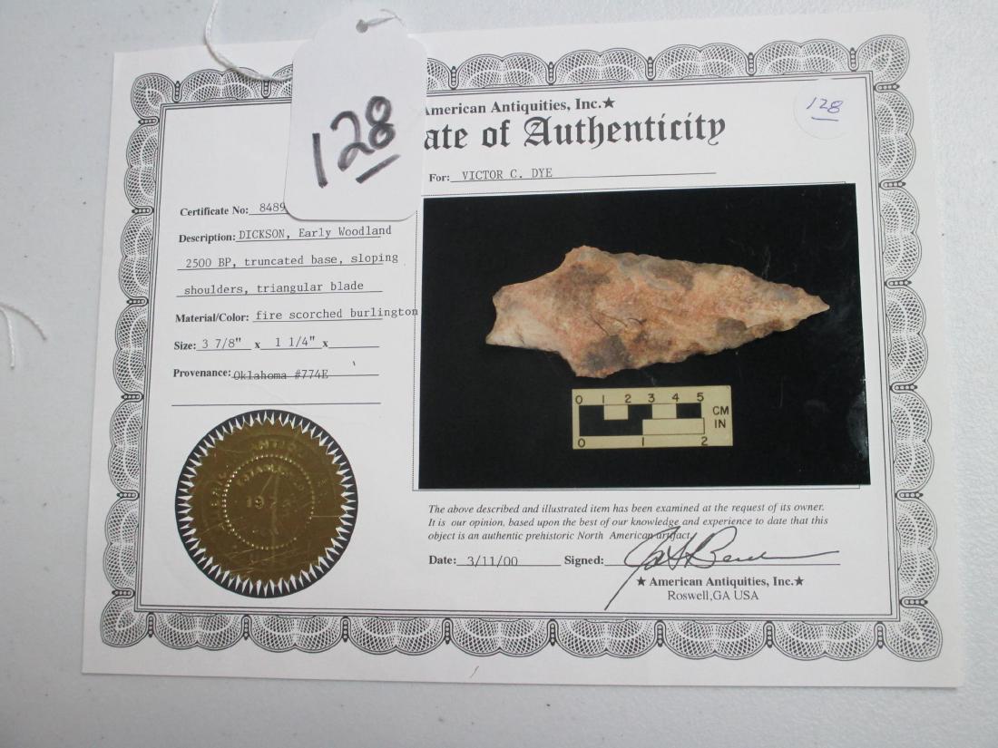 5 & 1/8in Long x 1 & 13/16in Wide Dovetail (St. Charles) with Ken Partain COA from Vinton CountyMar 01, 2026Horse Creek Beaver Lake with Insight COA from Benton County, Tennessee ex - Carl McCondy IndianMar 01, 2026Horse Creek Pine Tree with Insight COA from Madison County, Tennessee ex - Carl McCondy CollectionMar 01, 2026Horse Creek Beaver Lake with Insight COA from Lee County, Mississippi ex - Carl McCondy IndianMar 01, 2026Horse Creek Hopewell Snyders with Insight COA from Smith County, tennessee ex - Carl McCondyMar 01, 2026Fort Payne Adena with Insight COA from Humphreys County, Tennessee ex - Robert Washington CollectionMar 01, 2026Dickson - 3 1/4inMar 07, 20263 13/16" Afton "Exceptional Quality" 3 COA’s Found in Cass Co. MO COA’s Keele, Motley, MeadowsFeb 28, 20265 7/8" Massive Dickson, found in St. Louis Co., Missouri, Ex Dr. Dunsiff Jacksonville, Illinois, Ex Mar 01, 20263 1/8" Very Colorful Coral Arrowhead, Florida, Ex. Gorgas, Ex. Jim Lee, Ex. DickeyMar 08, 20262 3/4" Newan, Florida, Ex. Mumax, Ex. Jim Lee, Ex. DickeyMar 08, 20263.1/2" Hardin Creek Stained Burlington ILL EX: Walt McIntire Coll.Mar 08, 20262 1/4" x 1 1/8" Paint Rock Valley, Undetermined Chert, Alabama, COA DickeyMar 08, 20265 1/2" Dickson, Des Moines Co., IowaMar 01, 20262 1/8" Dalton, From Southeast Region of US, Ex. Walt McIntireMar 08, 20263 3/8" Fishtail Dalton, Great Patination and Color, found in ArkansasMar 01, 2026