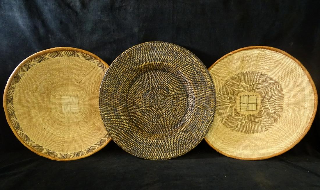 3 ASIAN WOVEN FLAT BASKETS 20''DIA..