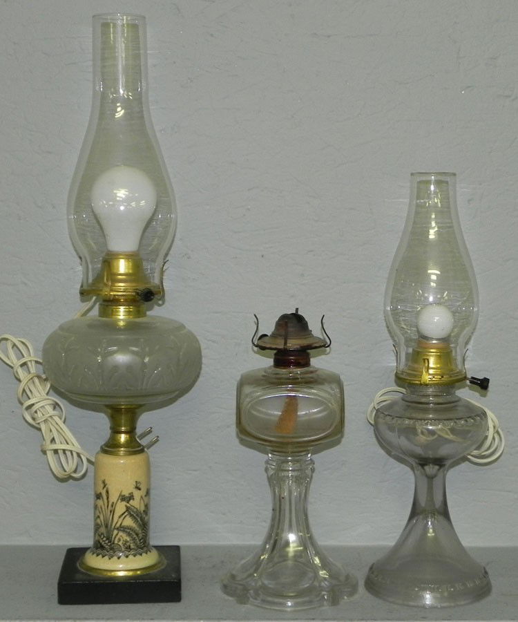 (3) assorted oil lamps. Two have been electrified.