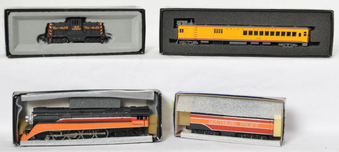 SoldN Gauge Trains GroupIncludes a Minitrix 2970 PRR 4-6-2 steam loco & tender; 3 Model power PRR heavyweights; Minitrix UP H10-44 diesel with Atlas caboose; plus assorted Con-Cor vehicles. Most are new in boxes, C8+-10See Sold Price