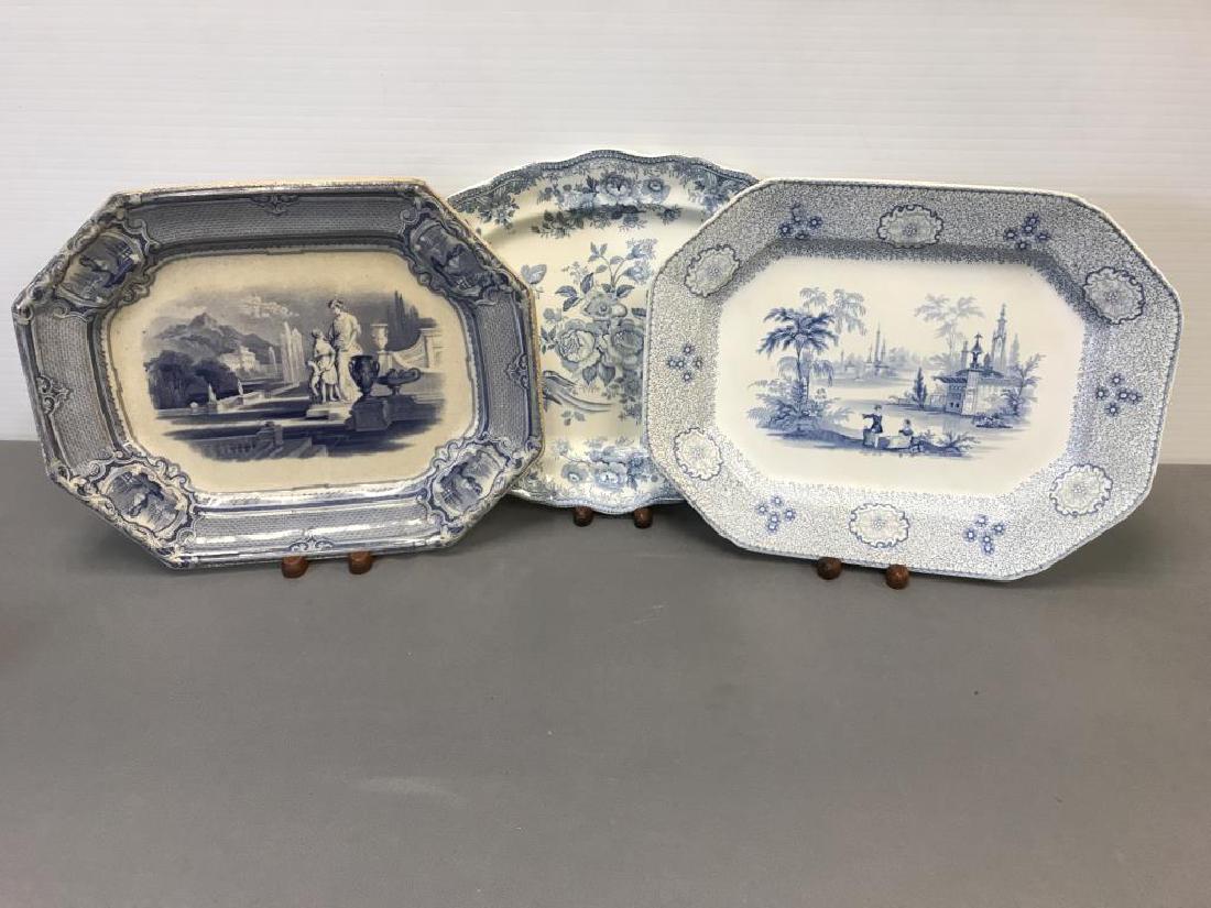3 blue transfer ware meat platters
