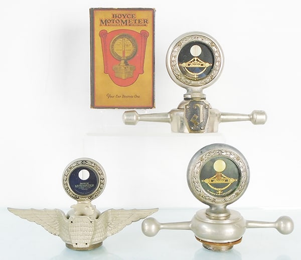 SoldBoyce Moto-Meters (3) Wings, Dogbone, UniversalA magnificent lot of three antique Boyce Moto-Meter radiator cap temperature gauges, iconic automotive accessories from the 1920s-1930s. The lot includes a "Universal Model" on a brass "dogbone" styleSee Sold Price