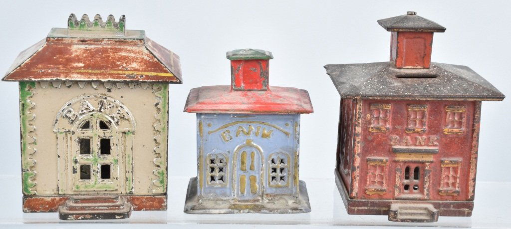 Oil Tins LotFeb 21, 2026Lot of Two Building Banks - Bethel College Library and Dollar Savings BankFeb 14, 20263 Antique Powder Tins w Schaghticoke Powder CoMar 07, 202614 Vintage Composition Train Layout BuildingsMar 07, 2026Large Patriotic Cupola/ State BankFeb 14, 2026Cupola Medium/ Small Victorian HouseFeb 14, 2026Three Cast Iron Building BanksFeb 14, 2026Four Tin Mechanical BanksFeb 14, 2026COLLECTION OF 5: TOBACCO POCKET TINSFeb 18, 2026Two Cast Iron Building Banks - Hexagon Building/Rose WindowFeb 14, 2026Two Cast Iron Building Banks - Rose Window / Smallest State BankFeb 14, 2026Three European Tin Banks - Watch Me Grow, Cylinder and Post BoxFeb 14, 2026Three Cast Iron Clown Banks. Including a mechanical clown b...Feb 19, 2026One and Two Car Cast Iron Garage BanksFeb 14, 2026Hall's Excelsior Bank- BrownFeb 14, 2026Two Still Banks with Original Boxes - Electrolux Fridge and Dollar Savings BankFeb 14, 2026
