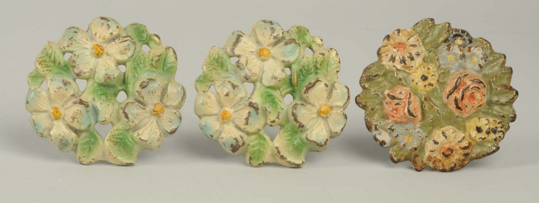 3 Cast Iron Assorted Flower Curtain Tie-Backs.