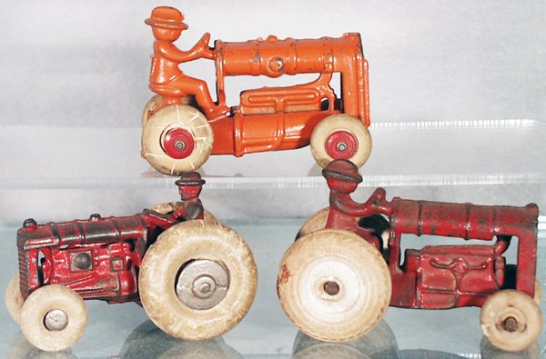 Sold3- CAST IRON TRACTORSIncludes John Deere restored with loose front tires, Fordson that all original, and Small Red Tractor thats all original. Largest 7" Very Good-ExcellentSee Sold Price