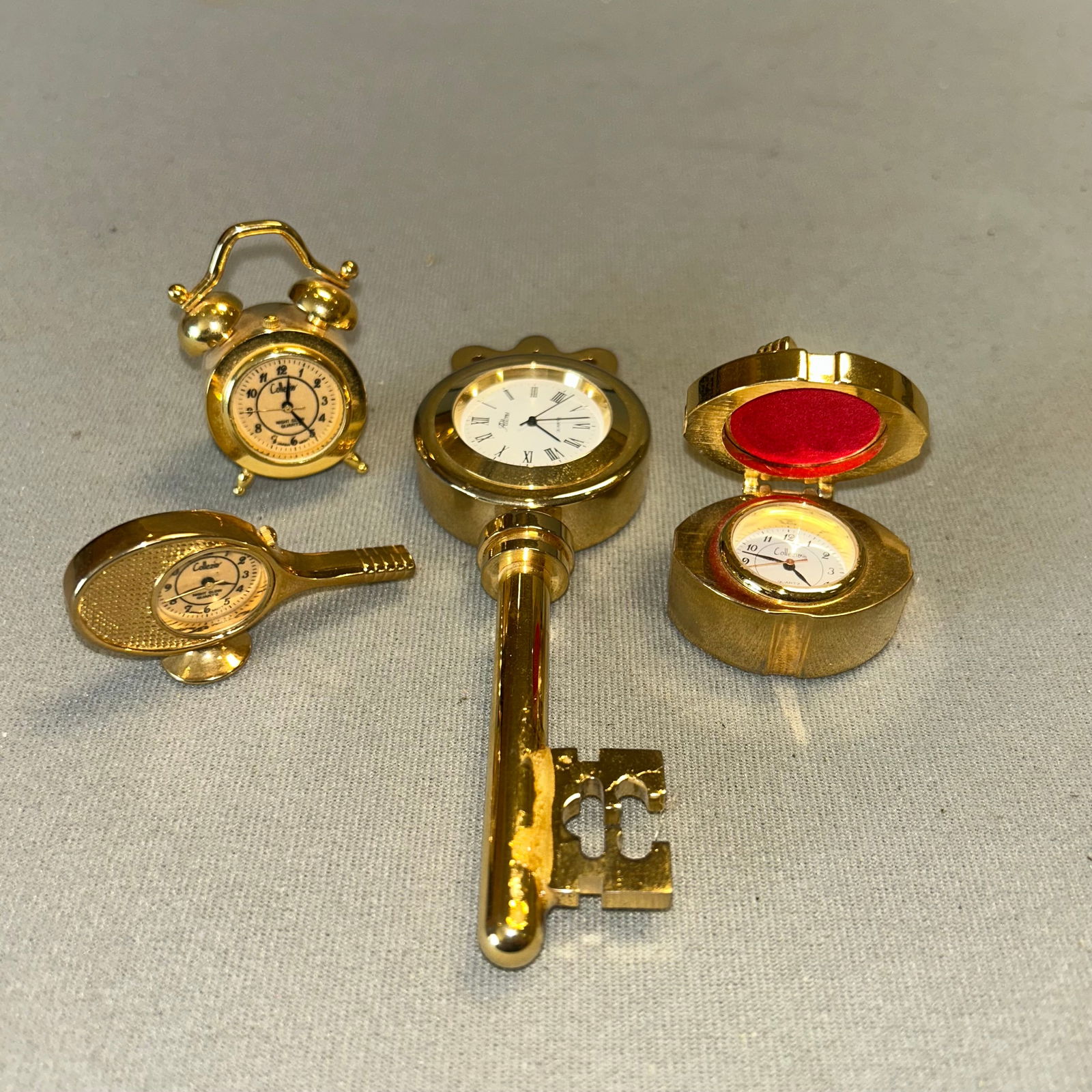 3 COLLEZIO BRASS MINI CLOCKS AND A ATTONS KEY