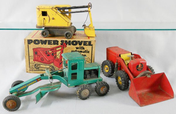 SoldLOT OF 3: CONSTRUCTION VEHICLE TOYS.(A) Hubely general digger in all original condition, with original tires. (B) Kenton Buckeye ditch digger, all original, no damage. (C) Kenton Jager cement mixer, all original with replaced strings. CSee Sold Price