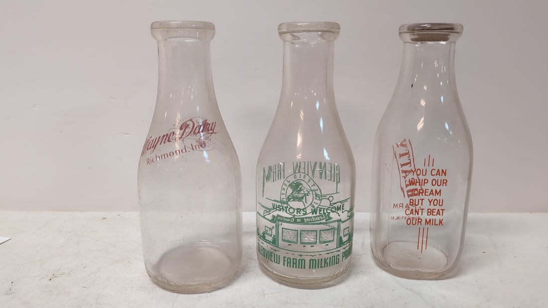 Lot Of 4 Assorted Mason Jars 3.5"X7"Mar 08, 2026Dairy Bottle Lot Inc. Glass, Shooter and Uranium MarblesMar 16, 2026ASSORTED LABELED COMMERCIAL BOTTLES, LOT OF FOUR4 days LeftASSORTED GLASS AND POTTERY BOTTLES / JARS, LOT OF FIVE4 days LeftASSORTED GLASS COUNTRY STORE AND OTHER ARTICLES, LOT OF THREE4 days LeftLot of 3 Assorted Stoneware Whiskey Jugs all w/ Original Cork or Stopper2 days LeftRound Hill Farm, Mullens Dairy, Deeds Bros.,Steels & Shoemake Guernsey Farms Dairy BottlesMar 16, 2026Round Hill Farm, Waldell Farms, Mihalys, Huntington, Valley Farms & Driving Park Dairy BottlesMar 16, 2026Vintage Ice Water Bottle And Glass Milk BottleMar 25, 2026Vintage Ice Water Bottle And Glass Milk BottleJun 28, 2025Vintage Ice Water Bottle And Glass Milk BottleJul 17, 20253 Quart Milk Bottles(4) Advertising milk bottlesMar 27, 2026Pair Of Vintage Collectible Glass Milk Bottles Including Winchester, KY. Dairy Bottle 3"X9.5"Mar 08, 20263PC Antique Glass Bottles13 hrs LeftPair Of Vintage Collectible Glass Milk Bottles Including Winchester, KY. Dairy Bottle 3"X9"Mar 08, 2026