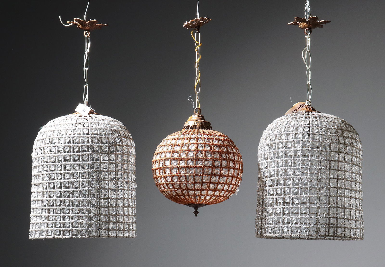 Sold(3) Empire Style Beaded FixturesThree Empire style lighting fixtures with beaded crystals, and gold-toned brass mountings, with matching pair of wall sconces, and one domed pendant chandelier height 25 in. x width 11 in . x depthSee Sold Price