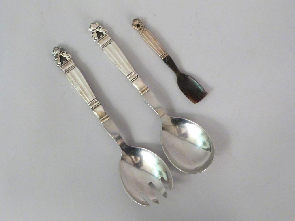 SoldGeorg Jensen Sterling Silver Serving Pieces, 3Group of Sterling ilver mounted Georg Jensen serving pieces, comprising a cake slice in the "Acorn" pattern and pair of small salad servers in the "Cactus" pattern, each marked "Georg Jensen" and "SteSee Sold Price