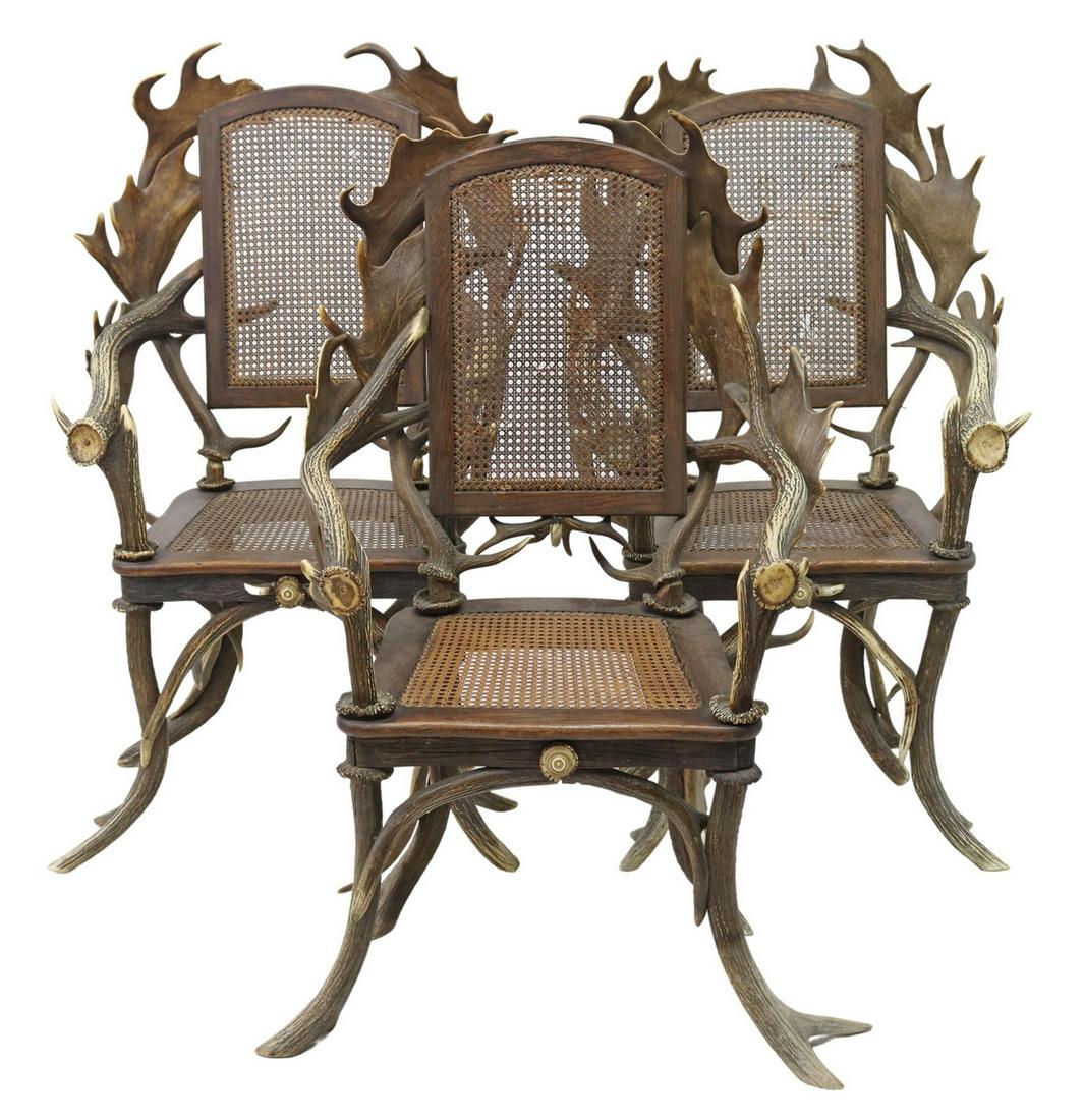 (3) GERMAN RUSTIC OAK & ANTLER ARMCHAIRS