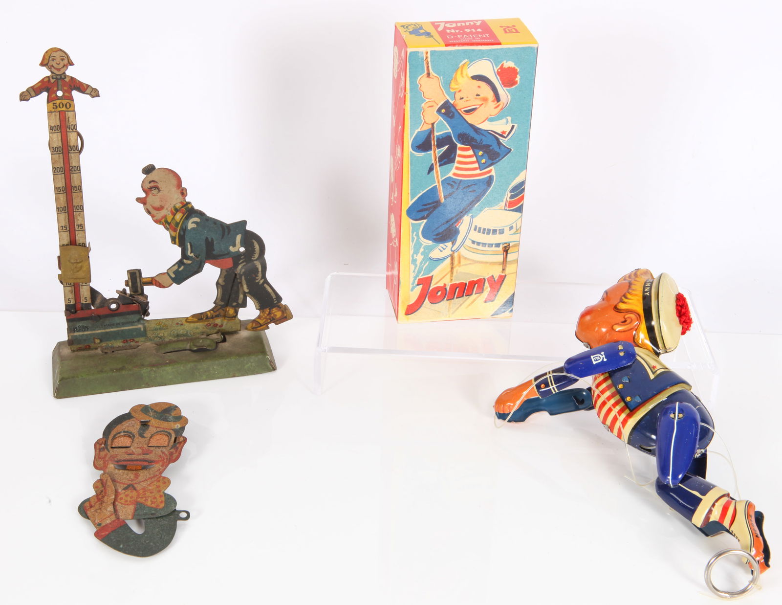 Sold3- GERMAN TIN PENNY TOYS, DANCERS & TRACTORLot includes a crank Dancer on Base, working, a Dancer on Round base, not working, and non mechanical Tractor. Largest is 4 3/4". ExcellentSee Sold Price