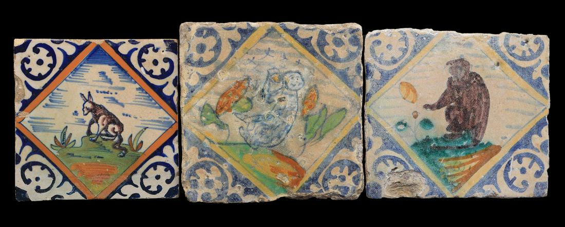 3 glazed earthenware square tiles