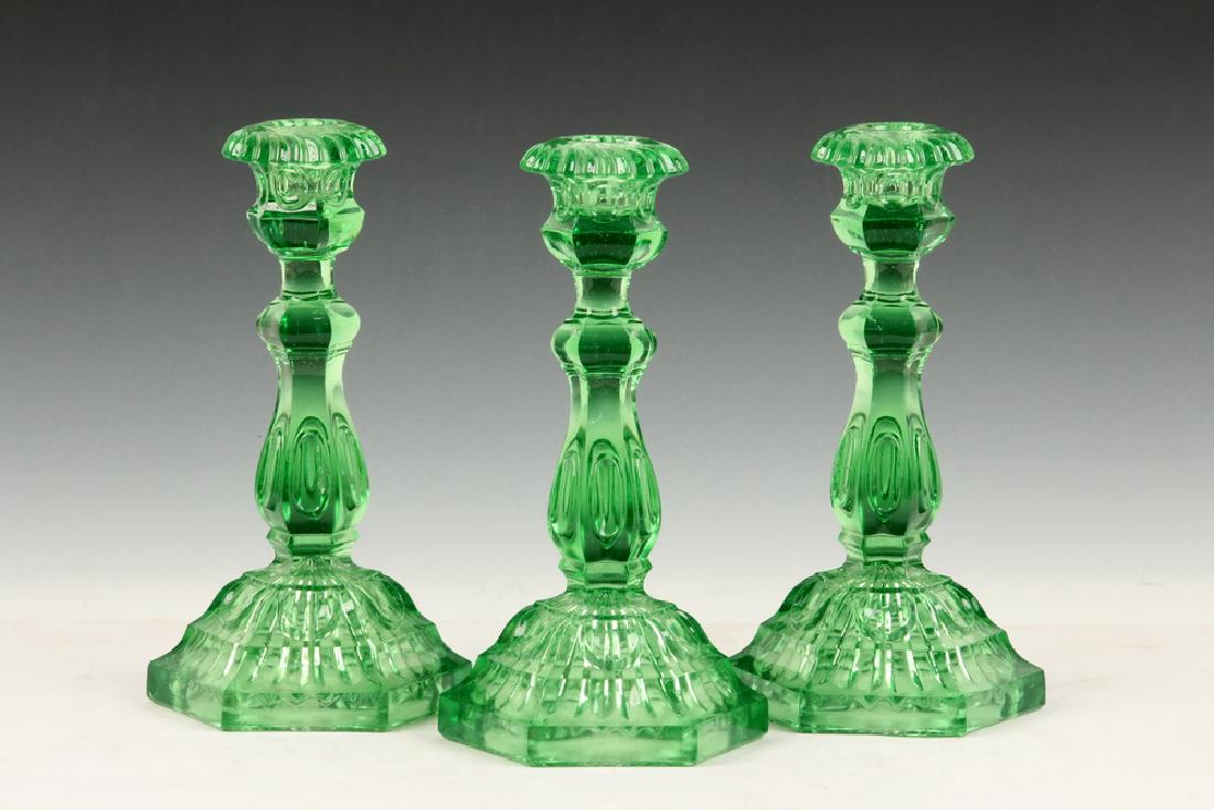 (3) GREEN PRESSED GLASS CANDLESTICKS