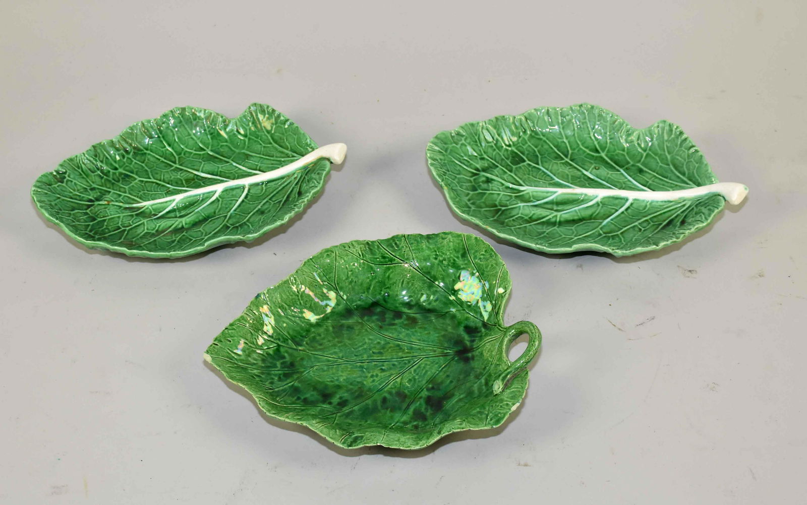 (3) MAJOLICA LEAF PLATES. Largest: 10.25''L. Condition: