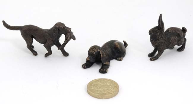 3 miniature cast models comprising hare, recumbent dog