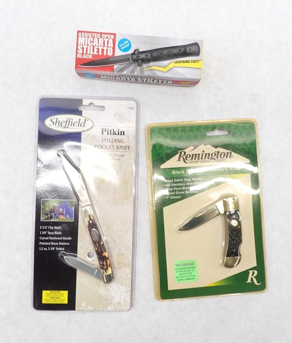 LOT OF 10 ASSORTED REMINGTON POCKET KNIVES.Feb 27, 2026LOT OF 3: BOXED MICROTECH METALMARKS AND TACHYON.Feb 25, 2026ASSORTED VINTAGE KNIVES. (qty) WE ARE UNABLE TO OFFER IN HOUSE SHIPPING ON THIS LOT4 days LeftLOT OF 4: BUCK FOLDING LOCK BACK KNIVES IN ORIGINAL BOXES.Feb 25, 2026LOT OF 4: BUCK USA FIXED BLADE HUNTING KNIVES ALL IN ORIGINAL BOXES.Feb 25, 2026LOT OF 4: C. PRE-1940 REMINGTON UMC MADE IN USA POCKET KNIVES.Feb 25, 2026LOT OF 3: ETCHED REMINGTON AND PAL SCOUT KNIVES IN ORIGINAL BOXES.Feb 25, 2026COLD STEEL Pendleton Lite Hunter and REALTREE Replaceable Blade Folding Knife LotFeb 22, 2026LOT OF 3: 2 MICROTECH OTF AUTOMATIC PUSH BUTTON KNIVES AND MICROTECH TOOL.Feb 25, 2026LOT OF 4: PRE-1940 REMINGTON UMC BARLOW, CONGRESS, AND SENATOR POCKET KNIVES,Feb 25, 2026(3) Mixed Lot Of Small Lot Of Pocket Knives4 days Left4 Fixed Blade Knives20 hrs LeftLot of 8 Knifes Fixed Blade20 hrs LeftTwo Knives Including an Imperial Ireland Whitetails Unlimited Hunting Knife and a NoveltyFeb 21, 2026Buck 119 in Sheath & Buck 722 Folding Knives(4) Different Sized Lock-Back Pocket Knives4 days Left