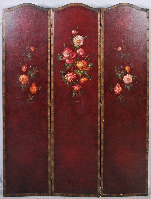 3 PANEL RED LEATHER SCREEN. PAINTED FLORAL DECORATION.