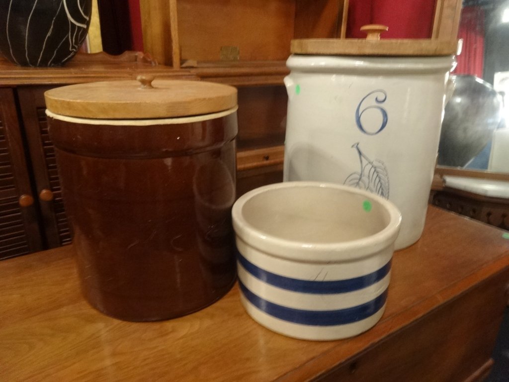 3 PC ANTIQUE STONEWARE, 2 WITH LIDS, LARGEST APPROX