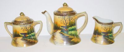 Sold3pc Vintage Japanese Nippon Porcelain Demitasse Tea SetHand painted service including a tea pot (6.5"H x 7.5"L x 5"dia), creamer (4"H x 4"dia), and sugar bowl (4.5"H x 5.5"L x 4"dia). Landscape with a boat, plane and a citySee Sold Price