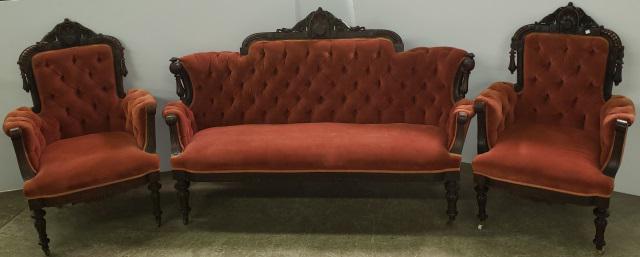 Sold(3) Pc Victorian carved walnut parlor set(3) Pc Victorian carved walnut parlor set, c/o sofa, and pair side chairs, red and cream floral upholstery, sofa 41"h x 61"w x 30"dSee Sold Price