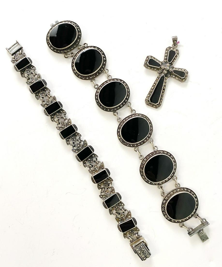 3 PCS. MARCASITE SILVER (2) BRACELETS (1) CROSS