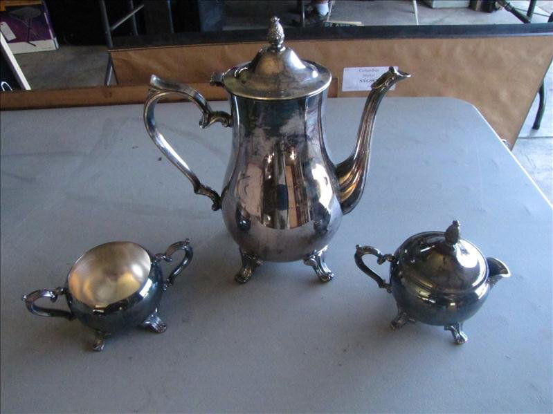 2pc Birmingham Silver on Copper Teapot with Burner and EPNS Coffee Pot5 days LeftSterling Coffee and Tea Set by Reed & Barton9 hrs LeftCollection of Antique & Vintage Silver Plated Tea & Coffee Ware TeapotsCollection of Antique & Vintage Silver Plated Tea & Coffee Ware TeapotsGroup of silver plate tea sets etc.Mar 19, 2026A five piece sterling silver tea and coffee service3 days LeftFancy silver plate tea pots and moreMar 19, 2026Lee & Wigfull Ltd. Silver Plate Tea Service, 3 Pcs2 days LeftGroup of silver plate tea setsMar 19, 2026Pair Danish Silver Tea and Coffee PotsMar 21, 2026Antique Esquire Sterling Silver Coffee/Tea 4 Piece ServiceJul 17, 2025AN ANTIQUE SILVER PLATED TEASET. Largest 27cm high. (3)7 days Left42.8 Troy Oz Sterling Silver Tea Pot and Lidded Sugar BowlMar 30, 20263pc Forbes Silver Co. USA Quadruple Plate Set- Teapot, Sugar Bowl5 days LeftSilverplate Tea Set, Tray, Coffee pot etc.Mar 20, 2026Sterling SIlver 3pc Tea service
