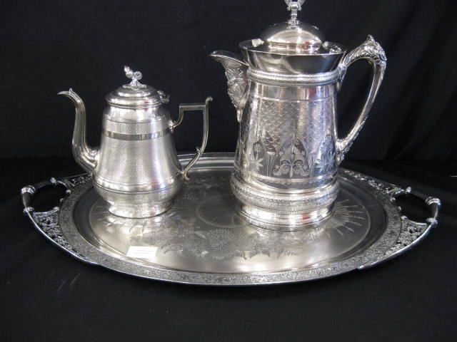 Sold3 PCS, SILVERPLATE TABLE ARTICLES, TRAY & PITCHERSContinental and British, 19th/early 20th century. Group of three silverplate serving pieces comprising etched glass pitcher marked "ASCI Germany", unmarked ewer form chocolate pot, and tray marked witSee Sold Price