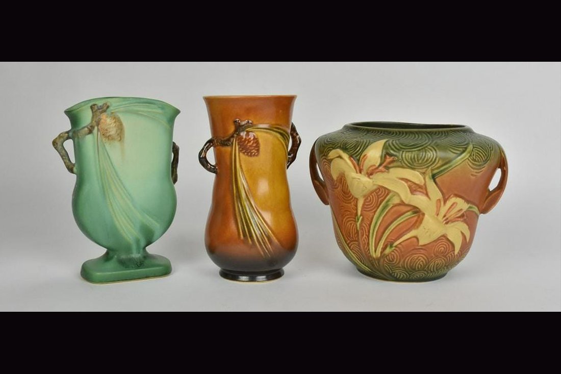 Lot of 3 Chinese Vases & Cup - Tea Dust, etc.1 day LeftLot of (4) Roseville Art Pottery VasesMar 15, 2026Lot of 4 Royal Haeger Pottery Pieces1 day LeftLot of (3) Art Pottery Pieces Roseville & Van BriggleMar 15, 20263 Pieces of Roseville Pottery1 day LeftFive retro jugs in glazed ceramics. Beautiful glazes and shapes. Belgium, 1960s / 70s.3 Pieces Roseville Pottery #915 and #130Mar 05, 20267pcs Roseville Pottery. Zephyr Lily. Vases and candlesticks.6 days Left3 Pieces Roseville PotteryMar 05, 2026Roseville Thornapple Vase #812 and Moss Vase #773, 1930'sMar 05, 2026Roseville Ixia Yellow Vintage Art Pottery Ceramic Vases BowlFeb 15, 2026Roseville Water Lily Pink Vintage Art Pottery Ceramic Vases BowlFeb 15, 20263pc Charles Todd for Rookwood Pottery VasesRoseville Arts and Crafts Monticello Vases (2)Mar 07, 20262 Pieces of Roseville Pottery1 day LeftRoseville Weller Vintage Art Pottery Vases BowlsMar 01, 2026