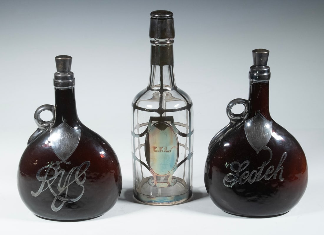 (3) SILVER OVERLAY LIQUOR BOTTLES