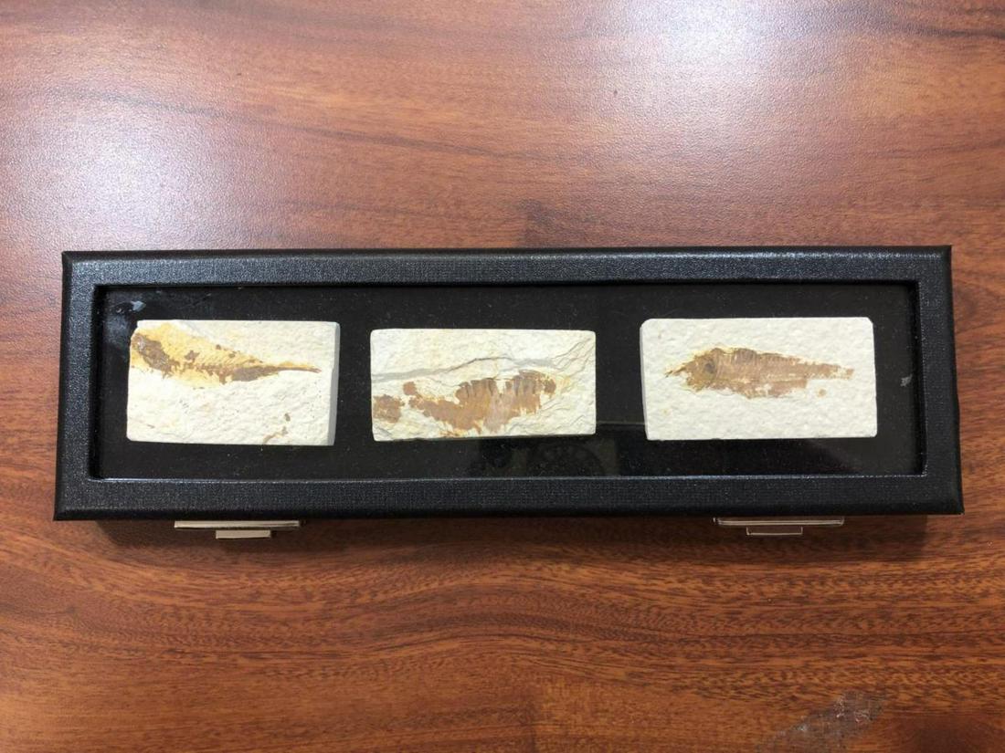3 Small Fossil Fish Eocene Era W/ Display Case